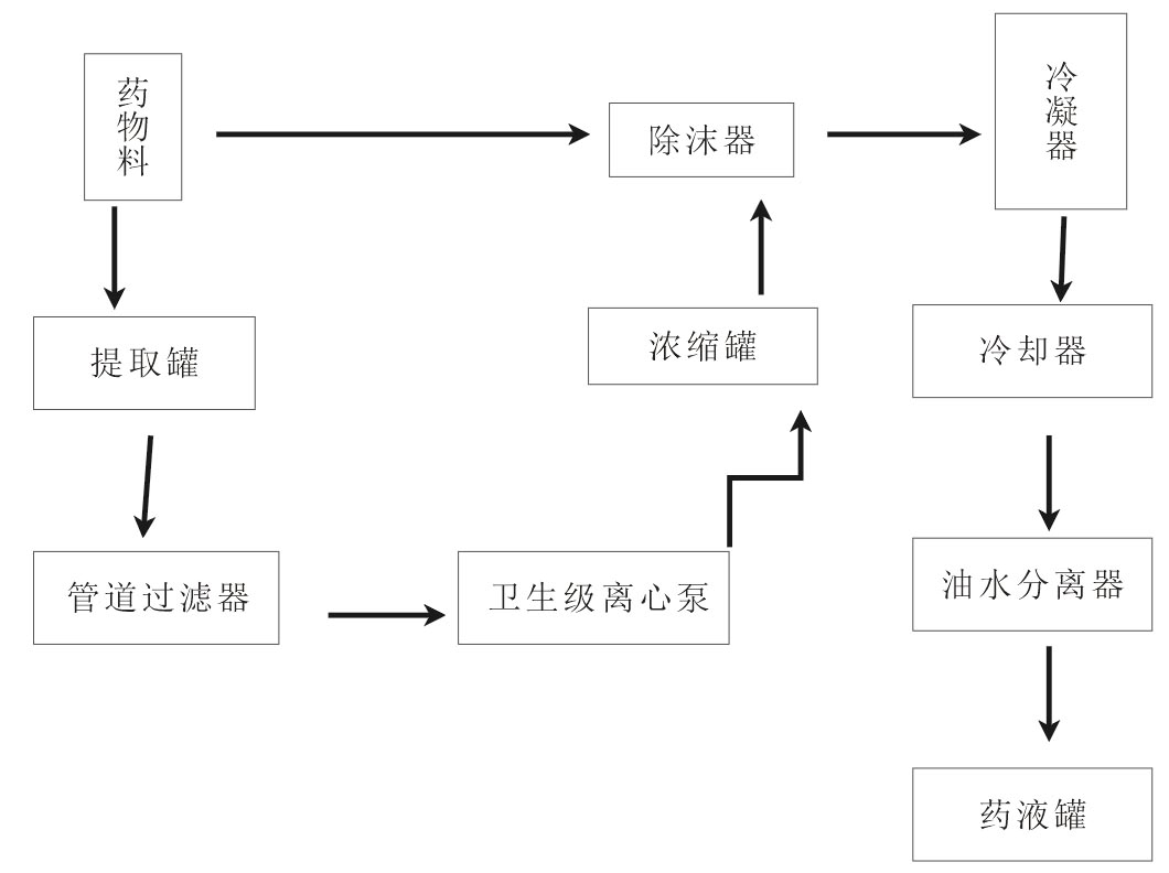 后至過濾器,進(jìn)入濃縮器。濃縮時(shí)產(chǎn)生蒸汽進(jìn)入冷凝器,成為冷凝液,作為新溶劑噴淋至提取罐同;提取罐內(nèi)產(chǎn)生的二次蒸汽,經(jīng)冷凝器冷